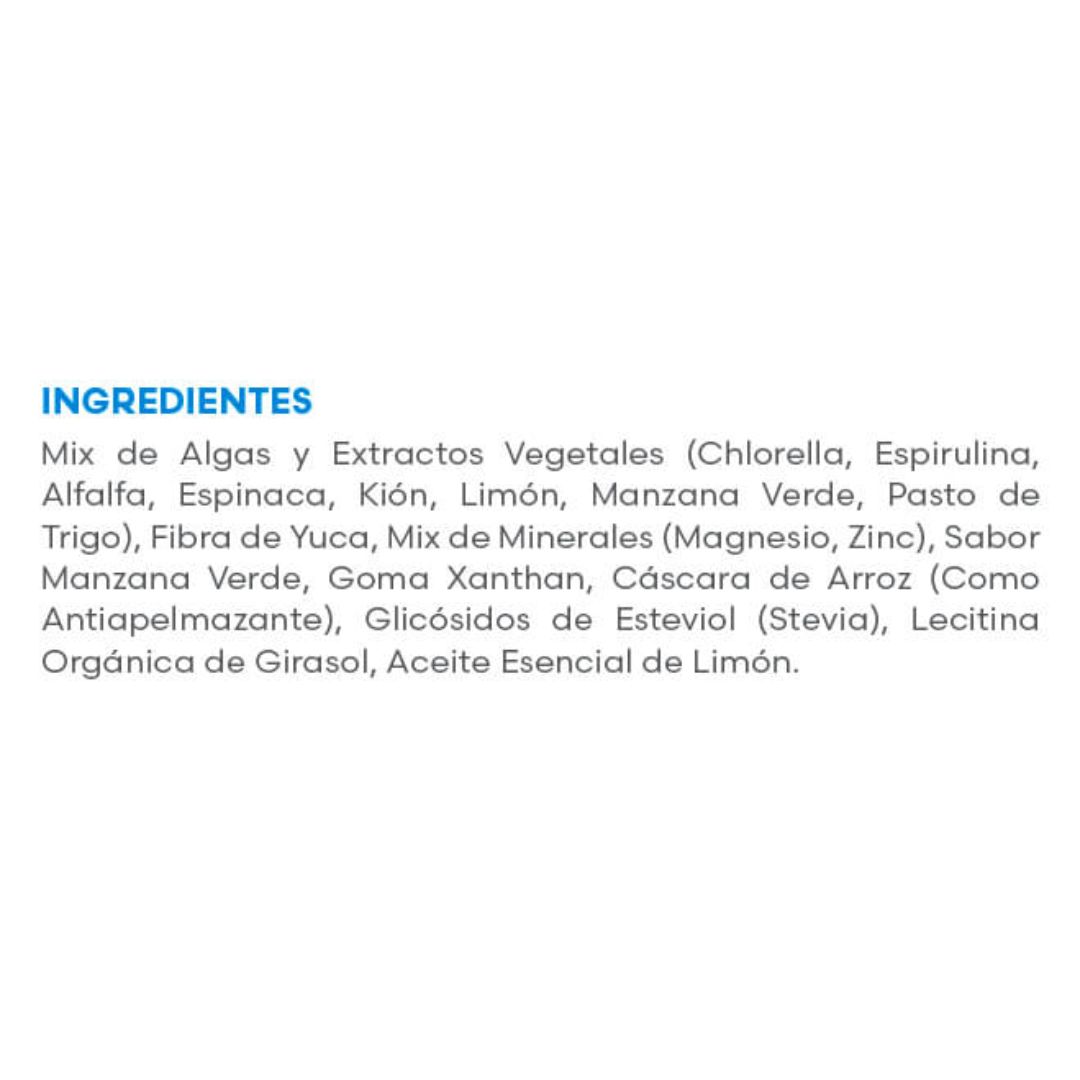 Contiene: ALFALFA + ALGAS (CHLORELLA + ESPIRULINA) + PASTO DE TRIGO + ESPINACA + MANZANA VERDE + LIMÓN + JENGIBRE + MINERALES (MAGNESIO + ZINC)